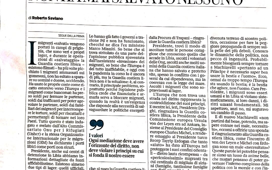 Roberto Saviano: lettera aperta al Presidente del Consiglio Mario Draghi